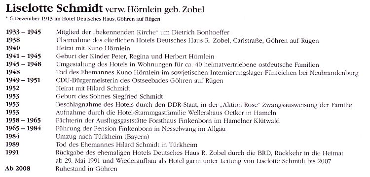| Beerdigungspredigt Liselotte Johanna Marie Schmidt, geborene Zobel verwitwete Hörnlein, geboren am 6. Dezember 1913 in Göhren, ist am 3. Februar 2012 in Bergen im Alter von 98 Jahren aus diesem Leben abgerufen worden. Heute geben wir ihre Asche zurück in Gottes Erde. Wir befehlen sie in Gottes Hand. Herr, sei ihr gnädig und lasse sie Frieden finden. Amen Gott spricht: Ich habe dich je und je geliebt, darum habe ich dich zu mir gezogen, aus lauter Güte. (Jeremia 31, 3) Liebe Angehörige, liebe Trauergemeinde, wir nehmen Abschied von Lieselotte Schmidt. Hier in Göhren auf der Familiengrabstelle soll sie heute ihre letzte Ruhe finden. Bevor wir uns auf den letzten Gang machen, wollen wir noch einmal innehalten und uns besinnen, auf ihr Leben besinnen. Und da fallen mir zunächst zwei Dinge besonders ins Auge. Das eine ist: Wir schauen heute auf einen langen und bewegten Lebenslauf zurück: Da ist viel geschehen in 98 Lebensjahren. Das andere ist: Dieser Lebenslauf ist in besonderer Weise mit Göhren, seiner Geschichte und seiner Kirchengeschichte verbunden. Und insofern ist es wohl nicht übertrieben, wenn wir heute sagen: Mit Lieselotte Schmidt tragen wir heute auch ein Stück Göhrener Geschichte zu Grabe. Den Anfang nimmt diese Geschichte am 6. Dezember 1913. An diesem Tag wird Lieselotte Johanna Marie Zobel als zweites Kind des Hoteliers Reinhold Zobel und seiner Frau Marie im Deutschen Haus in Göhren geboren. Hier wird sie am 7. Dezember 1913 auch getauft. Das Göhrener Taufgeschirr – von ihren Eltern gestiftet – trägt bis heute die Initialen der Mutter: M.Z.. Und sie ist eine der ersten, die daraus die Taufe empfängt. Lieselotte wächst in Göhren auf. Hier geht sie die ersten Jahre auch auf die Privatschule in der Kastanienallee. Danach besucht sie die Handelsschule in Stralsund. 1928 wird Lieselotte konfirmiert. anschließend arbeitet sie bei den Eltern im Deutschen Haus. Und im Frühjahr 1930, so wird berichtet, liest sie den Eröffnungsprolog bei der Einweihung der Göhrener Kirche. In diesen Jahren lernt sie auch den Arzt Wilhelm Heinrich Wiemer kennen. Am 29. September 1936 heiraten sie in der Göhrener Kirche und Lieselotte zieht mit ihm nach Köln. Aber die Ehe ist nicht von Dauer. Nach der Trennung 1938 kommt sie zurück nach Göhren und übernimmt den Hotelbetreib. Und hier lernt sie Kuno Hörnlein kennen und lieben, der als Angestellter im Haus arbeitet. 1940 heiraten Lieselotte Wiemer und Kuno Hörnlein. Ein Jahr später erblickt der erste Sohn Peter das Licht der Welt. Aber er stirbt nur wenige Wochen nach der Geburt. Dann, 1943, wird die Tochter Regina geboren und 1945 der Sohn Herbert. Ja, es sind schwierige Zeiten, die sie zu meistern hat: Da sind die schwierigen politischen Verhältnisse, in die sie sich mutig einmischt: Lieselotte Hörnlein ist Mitglied der Bekennenden Kirche. Da ist das Elend der Kriegsflüchtlinge, für die im „Deutschen Haus“ Quartiermöglichkeiten geschaffen werden. Und da ist die Notwendigkeit, ständig allein entscheiden zu müssen. Denn ihr Mann kehrt zwar aus Krieg und englischer Gefangenschaft zurück, wird aber wenig später von den Russen inhaftiert. Sie hofft auf seine Rückkehr, und engagiert sich auch politisch als 2. Bürgermeisterin in Göhren. Dann aber, 1951 muss sie erfahren, dass ihr Mann bereits 1948 in Fünfeichen ums Leben gekommen ist.. Aber Lieselotte Hörnlein lässt sich nicht unterkriegen. 1952 heiratet sie Hilard Schmidt. Und 1953 wird der Sohn Siegfried geboren. Dann aber kommt 1953 die unselige Aktion Rose. Hilard Schmidt kommt ins Zuchthaus und sie wird ausgewiesen. Und so bleibt am Ende nur der Weg in den Westen. Über Berlin und Hamburg führt der Weg zunächst nach Hameln. Hier übernehmen Lieselotte und Hilard Schmidt 1958 eine Ausflugsgaststätte mit Garten und Viehzeug und unendlich viel Arbeit. Dann, von 1965 bis 1984 betreiben sie die Pension Finkenborn in Nesselwang im Allgäu. 1984 ziehen sie nach Türkheim um. Und dort stirbt 1989 auch ihr Mann. Ihr Weg ist damit aber noch lange nicht zu Ende. Denn mit der Wende erhält sie ihr Eigentum in Göhren zurück. Und Stück für Stück baut sie den Hotelbetrieb wieder auf. Erst 2007 geht sie in den Ruhestand. Aber auch der ist eher ein Unruhestand: Wie schon in den Jahren zuvor ist sie unglaublich viel auf Reisen. Sie bereist die ganze Welt. Mit 55 lernt sie französisch. Mit 60 spanisch. Und manche Reisegeschichten wie die vom Weihnachtsfest 1994 auf dem Schiff vor den Fidschiinseln mit den singenden Kindern: Wir sind alle Gottes Kinder. Die hat sie nie vergessen und oft und gern erzählt. Daneben ist